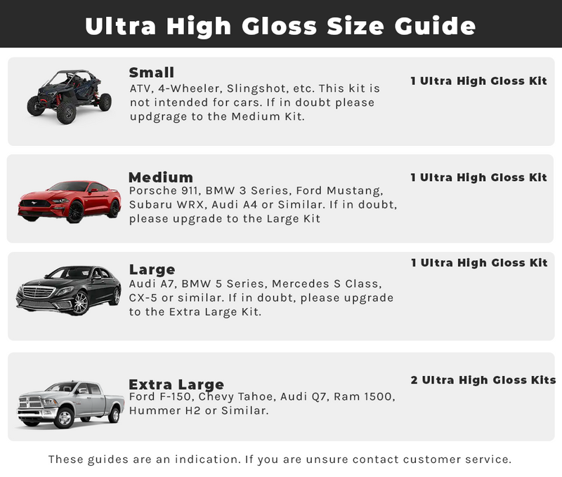 - Small, Medium, Large Cars: 1 Ultra High Gloss Kit